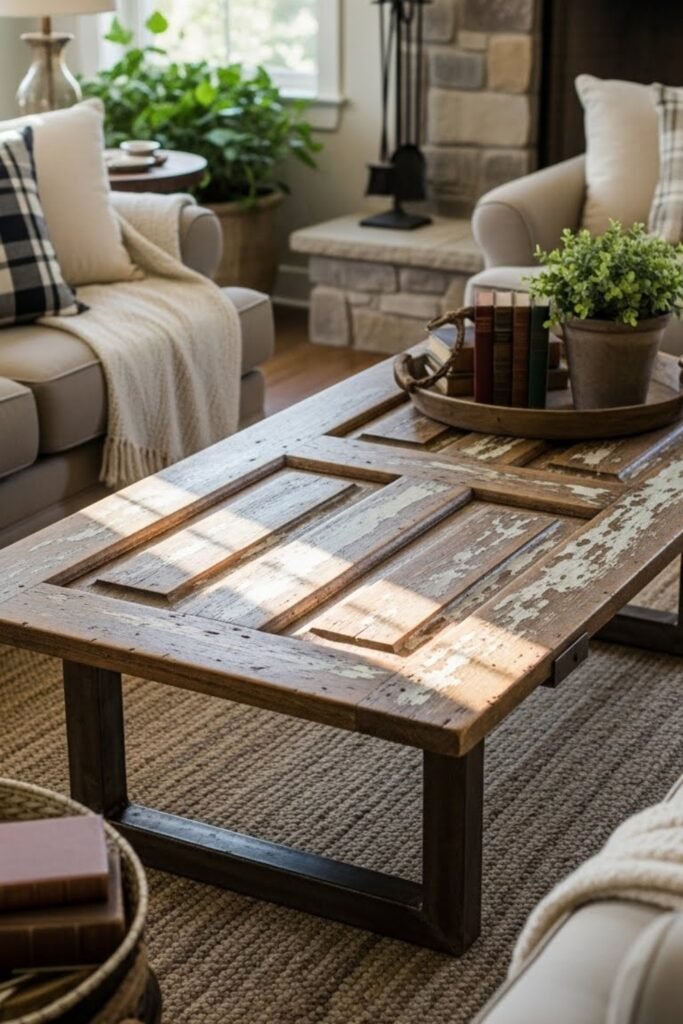 A reclaimed door coffee table turns old materials into a statement piece. Cut an old wooden door to size or use it as-is, then add legs or a base.