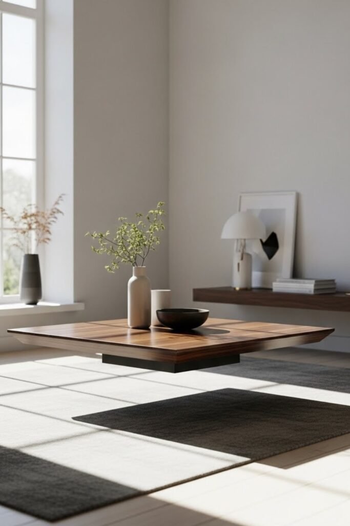 A floating coffee table creates a modern, minimalist look. Build a low-profile box and mount it slightly off the floor using hidden supports or a recessed base.