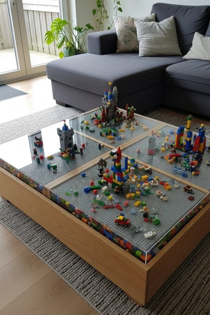 A LEGO coffee table adds fun and creativity to a family room. Build a simple table frame and attach a LEGO baseplate on top or beneath a clear surface.