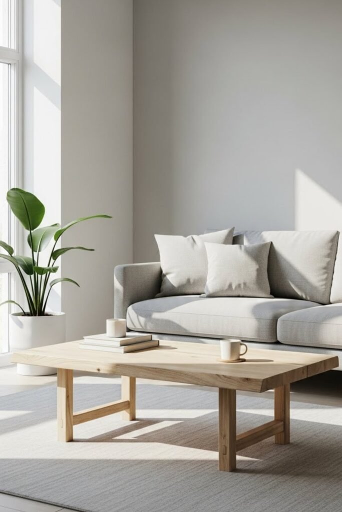 A minimal slab coffee table focuses on clean lines and simplicity. Use a thick wood or plywood slab paired with simple legs.