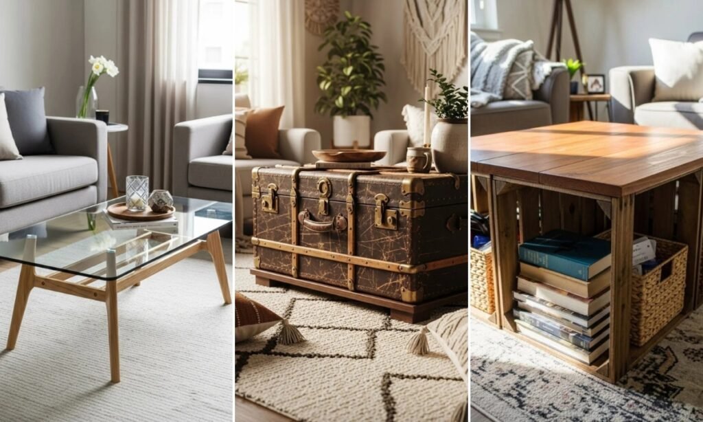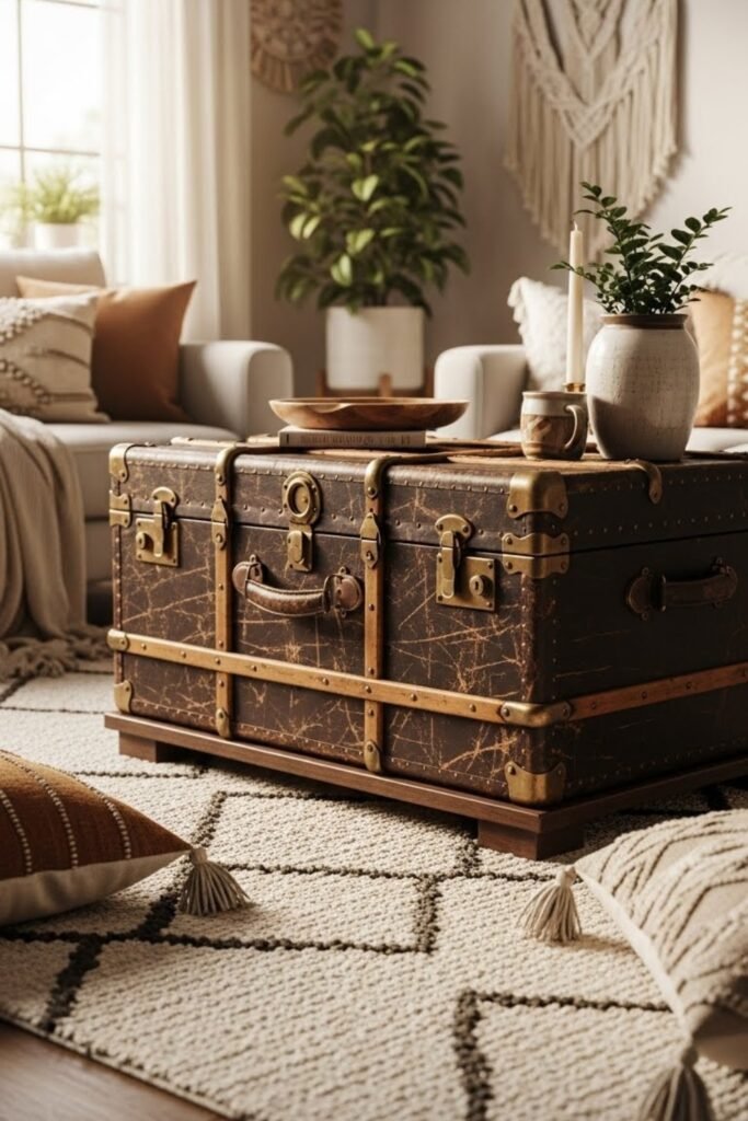 A trunk coffee table combines storage and statement style in one piece. Use a vintage trunk or build a wooden box with a hinged lid. The top works as a table surface while the inside stores blankets or games.