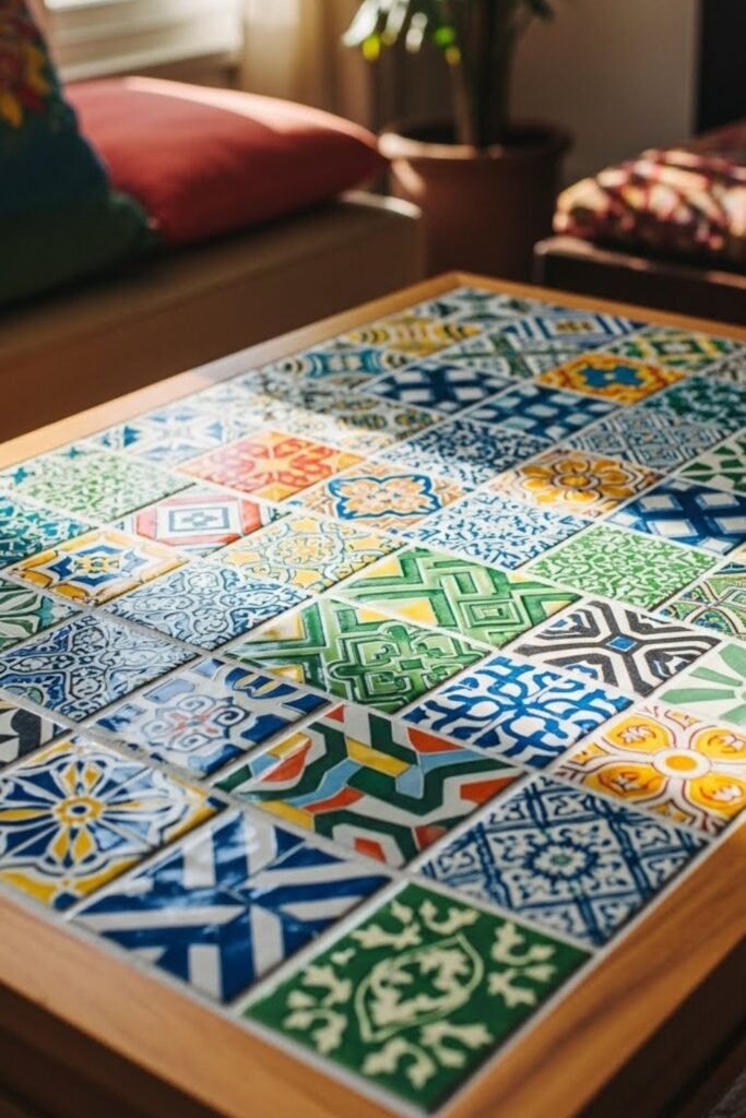 Grout and seal the surface so it’s durable and easy to clean. This idea works beautifully in boho, Mediterranean, or eclectic living rooms.