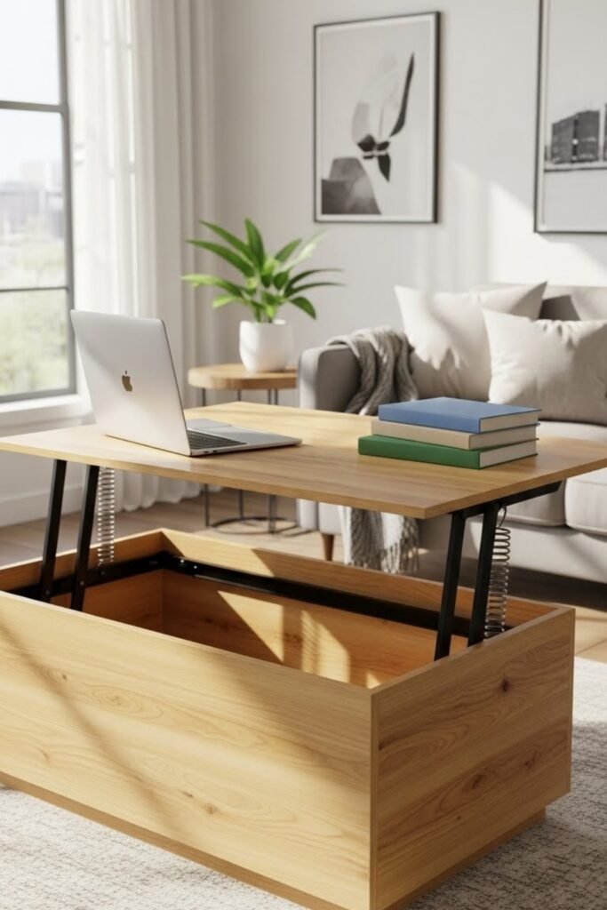 The top rises easily to create a workspace or dining surface. This idea is perfect for apartments or living rooms where space needs to work harder.