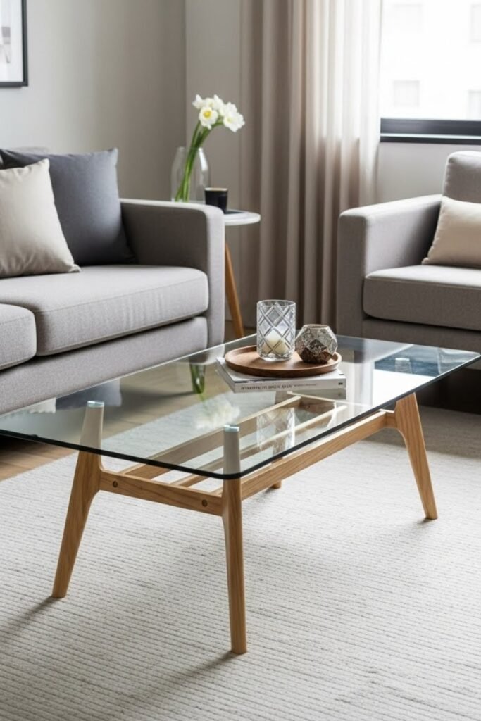 A glass-top coffee table keeps the room feeling open and light. Build a wooden or metal base and place a tempered glass sheet on top.