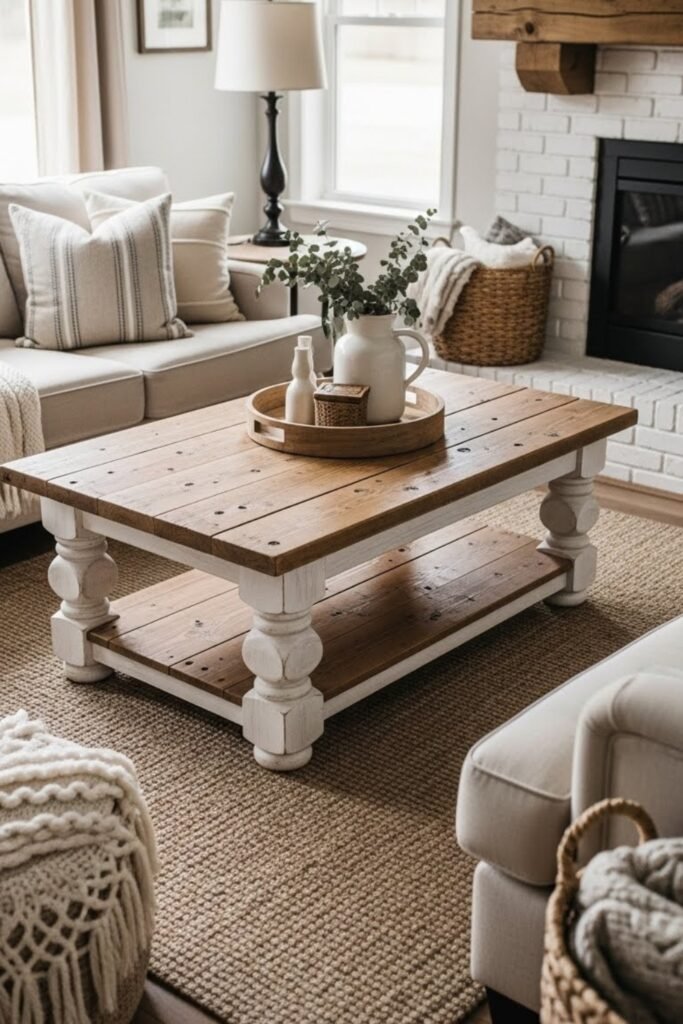 A farmhouse-style coffee table brings warmth and charm into the space. Use thick wood planks, a sturdy base, and simple joinery.