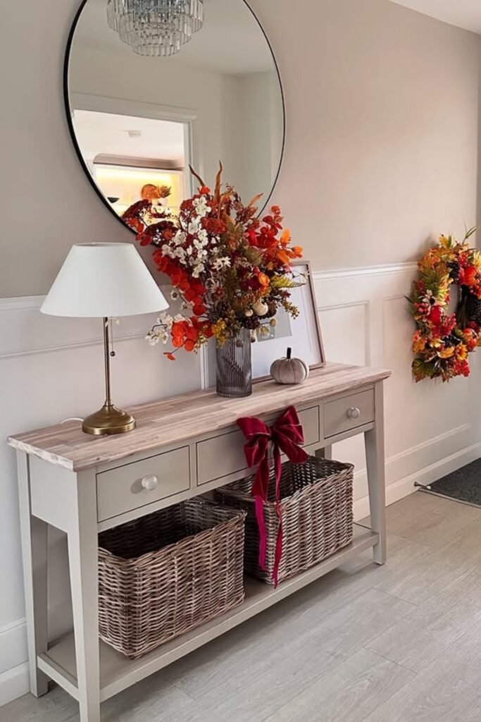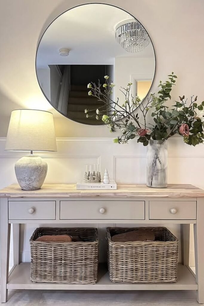 Drawer-and-basket consoles quietly manage daily mess while keeping entryways calm and visually organized without bulky storage units nearby.
