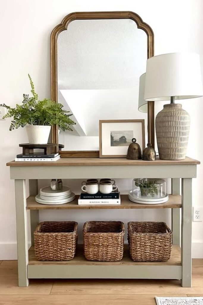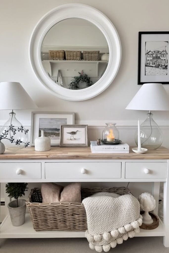 Soft painted consoles with baskets suit calm interiors that need storage without breaking the neutral flow visually apart.