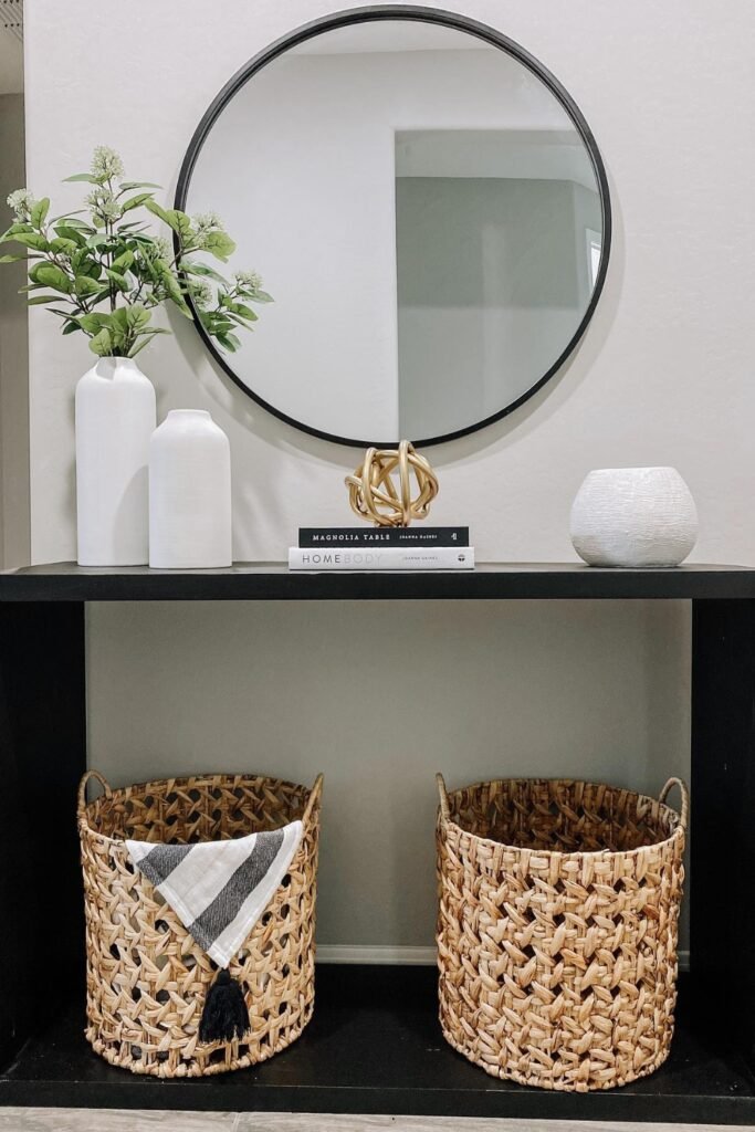 Use it along blank walls where symmetry, baskets, and mirrors complete a balanced composition without visual clutter distractions.