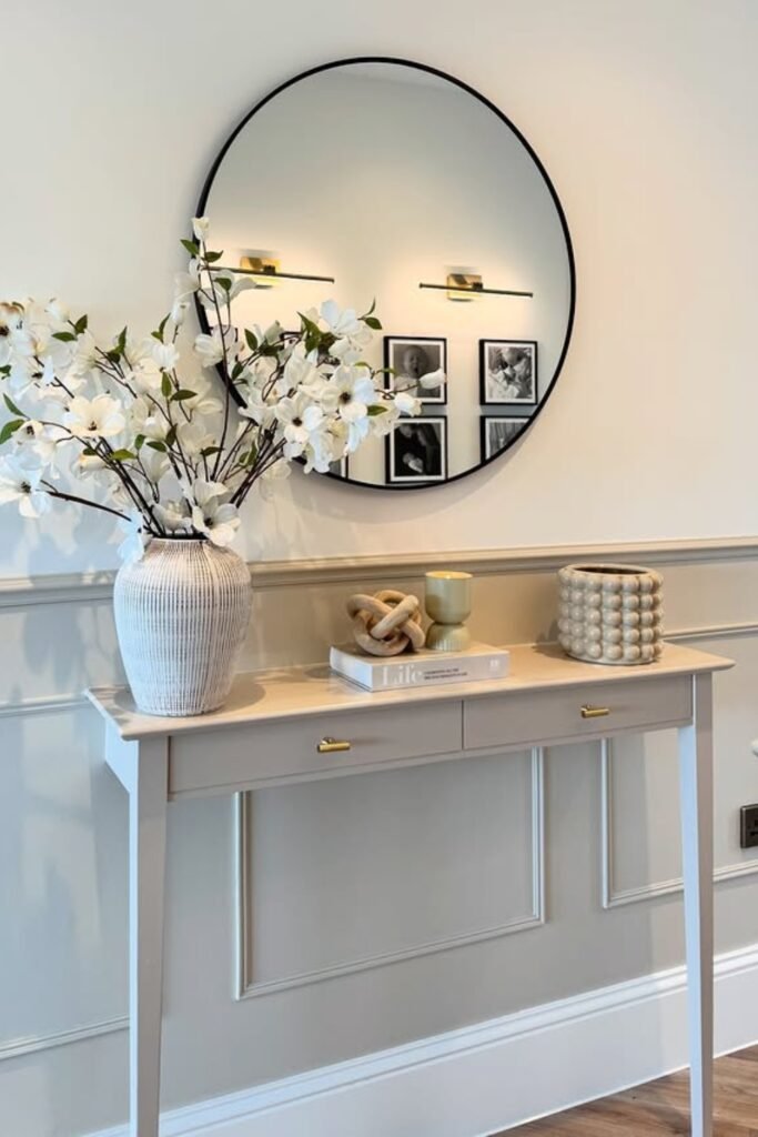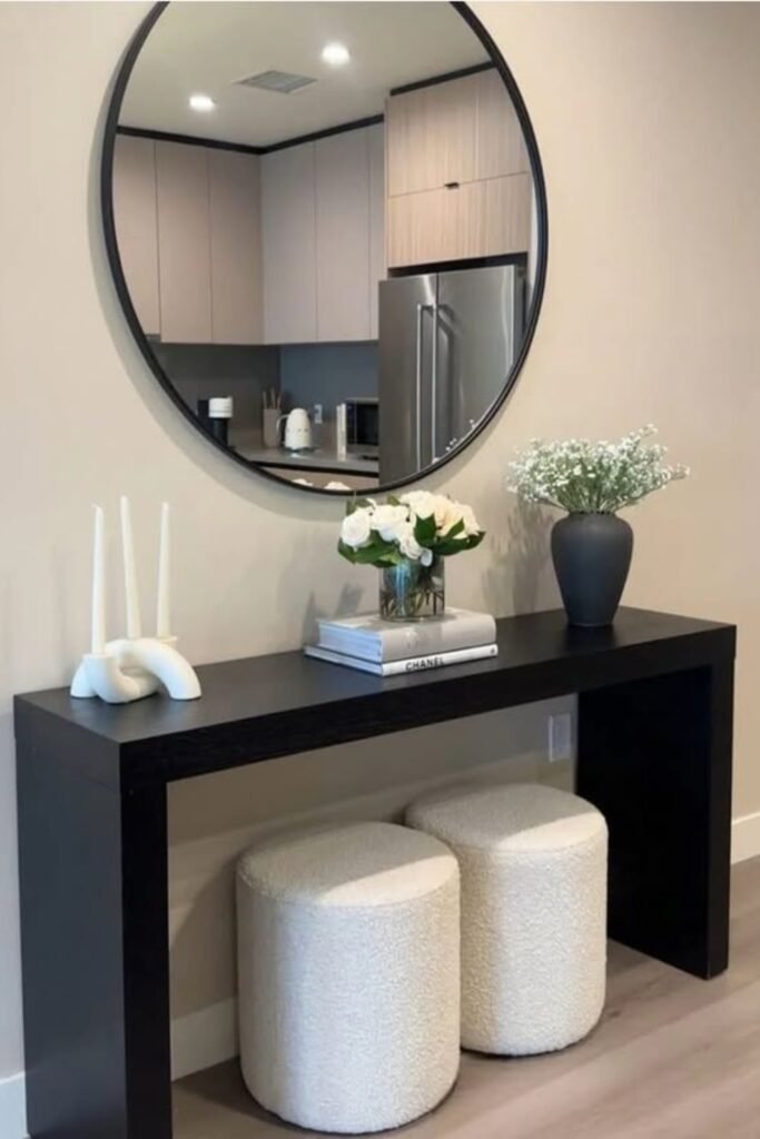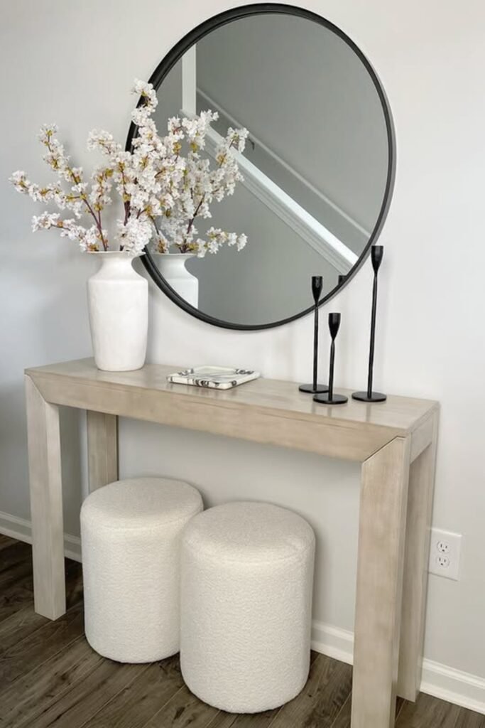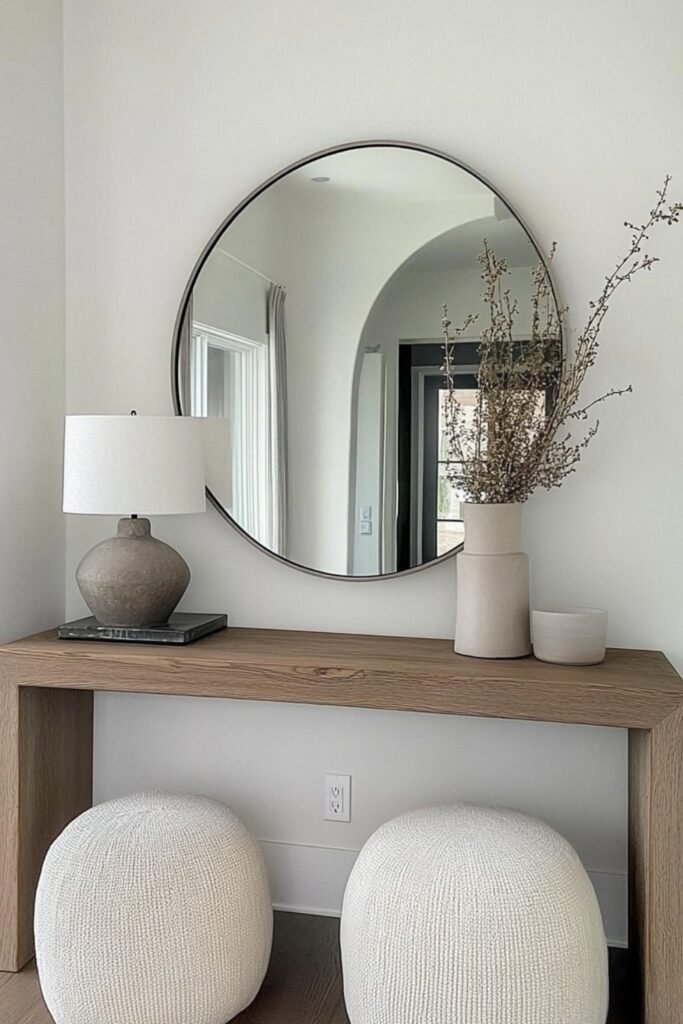 This works best against blank walls where art feels excessive but you still want a strong focal anchor.