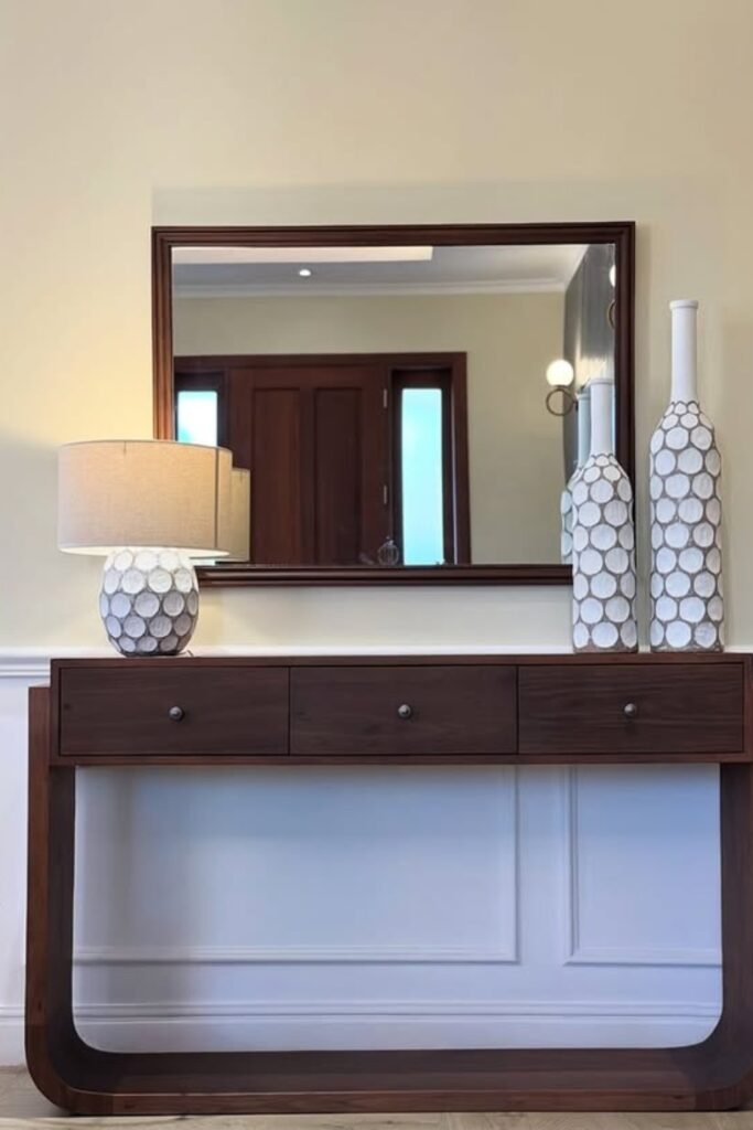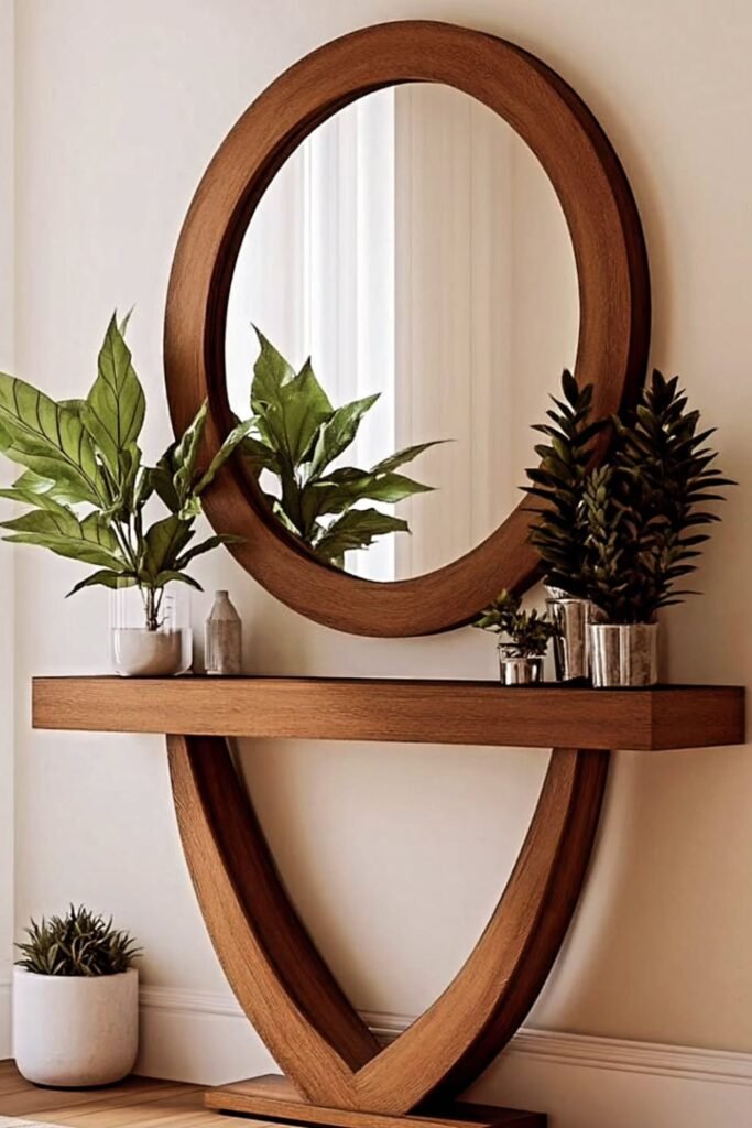 That curved wood base turns a console table into sculpture, perfect for entryways needing presence without visual heaviness.