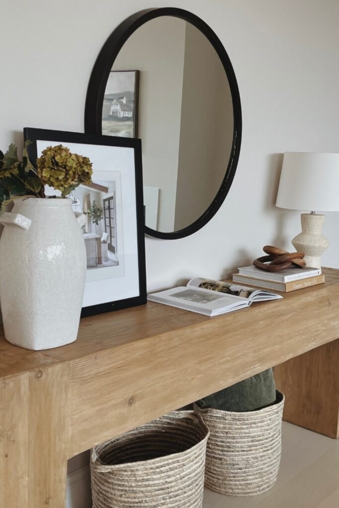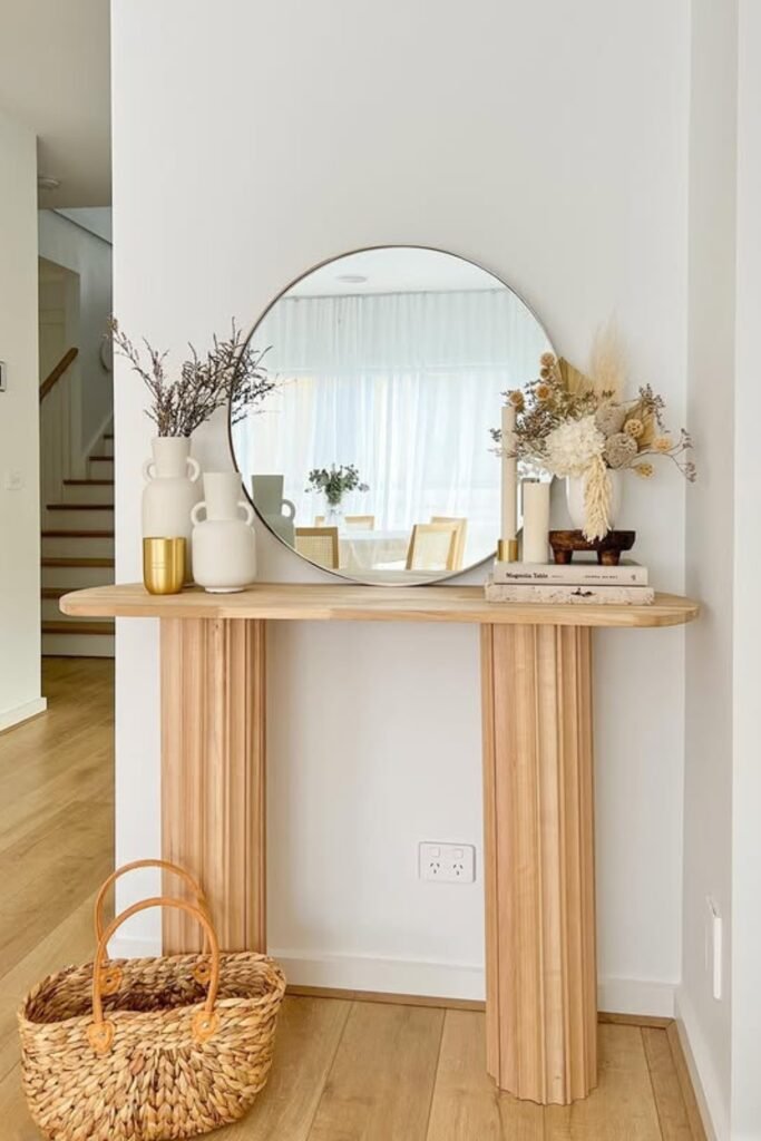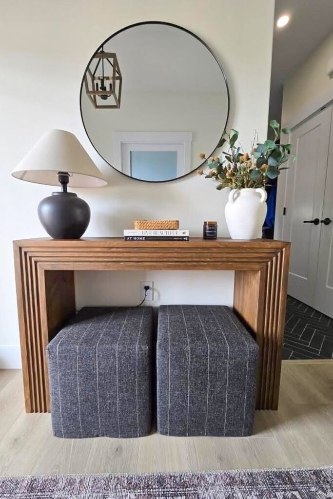 This fluted wood console creates a soft focal point while solving shallow entryway storage and styling needs daily beautifully.