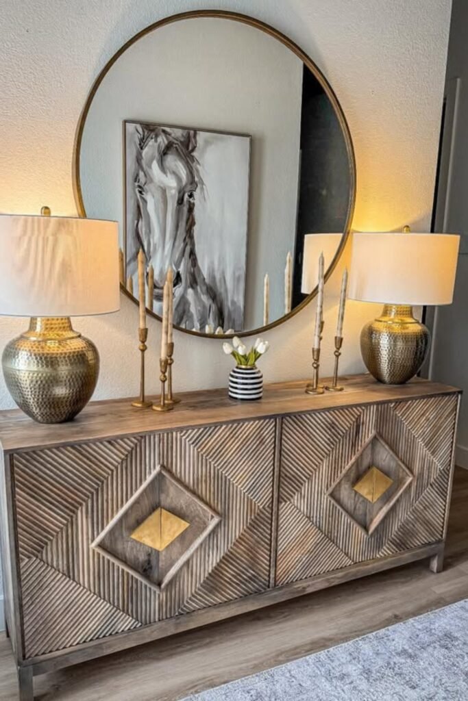 Textured cabinet fronts instantly elevate a console, turning basic storage into a focal piece for entryways living rooms.