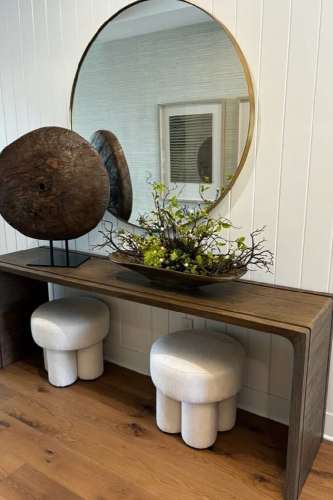 A warm wood console with tucked stools solves narrow spaces while adding softness and everyday functional seating flexibility.