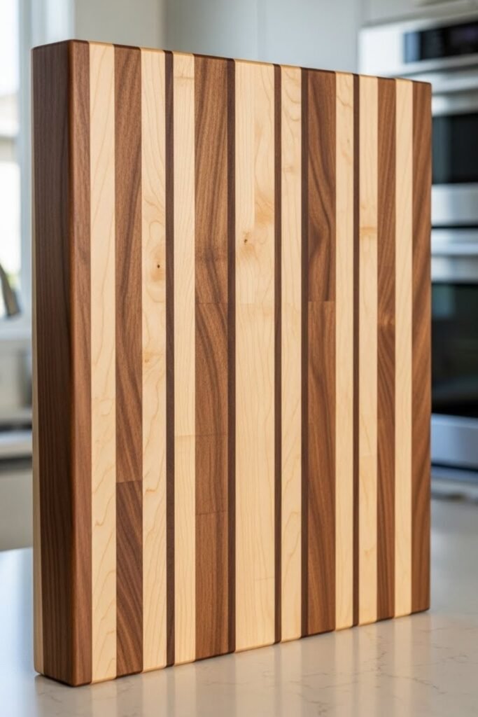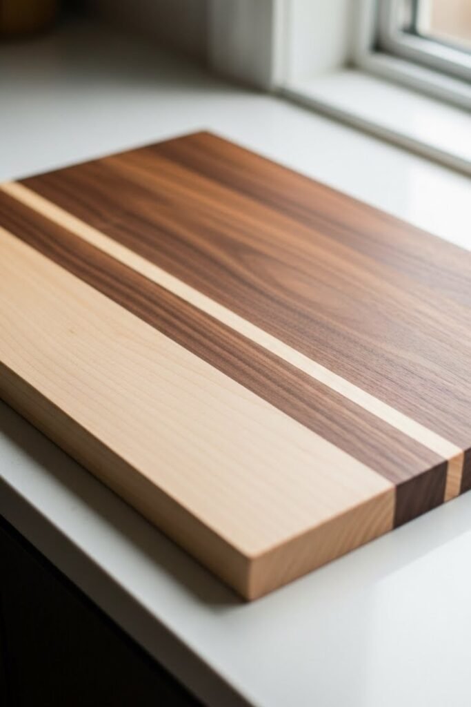 A two-tone cutting board uses two contrasting wood species joined side by side. Choose woods with clear color differences, like maple and walnut.