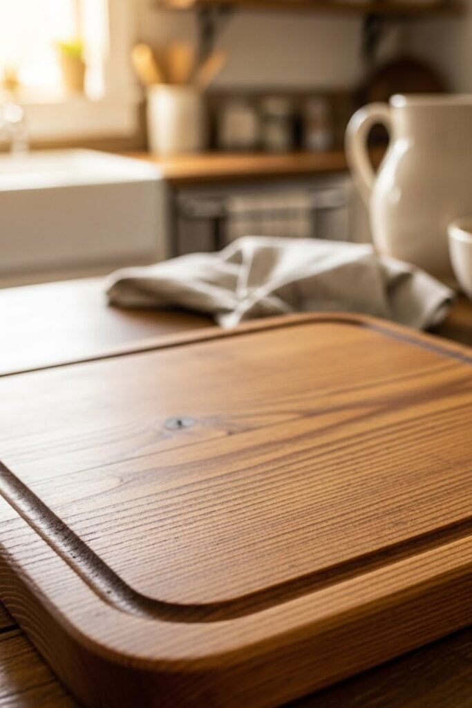 A farmhouse cutting board features thicker wood, softened edges, and a warm, rustic finish. Use wider boards and round the corners slightly for a cozy feel.