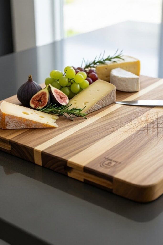 A serving combo cutting board works for both prep and presentation. Keep one side plain for cutting and add light detailing on the other for serving.