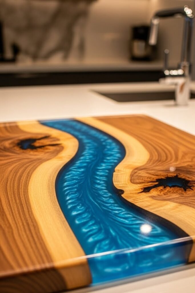 An epoxy river cutting board combines wood slabs with colored or clear epoxy poured between them. Use two narrow boards with a gap in the center, seal edges, then pour epoxy slowly.
