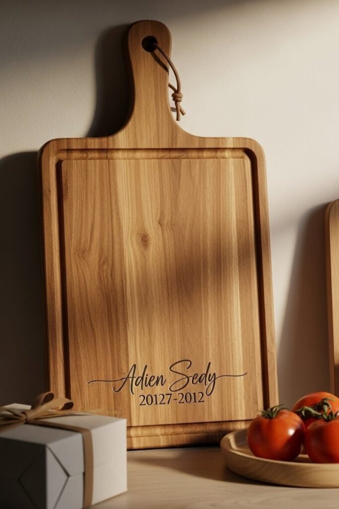 A personalized cutting board includes names, dates, or short messages. You can add details using wood burning tools, engraving bits, or vinyl stencils with paint.