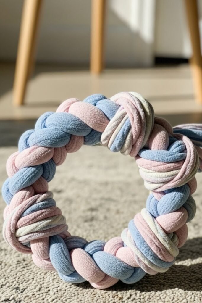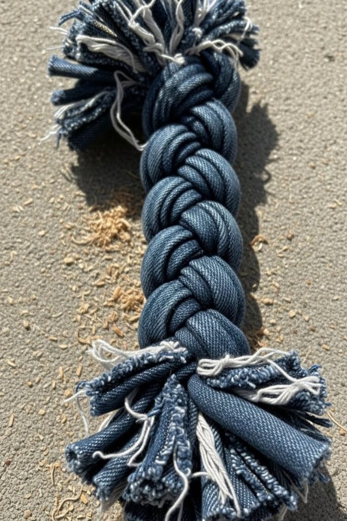 Cut old jeans into wide strips and tie multiple knots along the length. The thick denim texture satisfies chewing and tugging instincts.