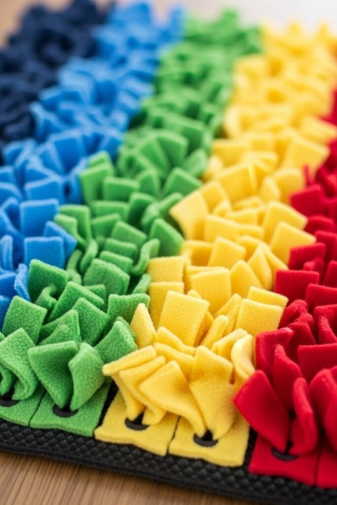 Create a snuffle mat using a rubber mat base and fleece strips. Tie the strips through the holes and hide treats between them.