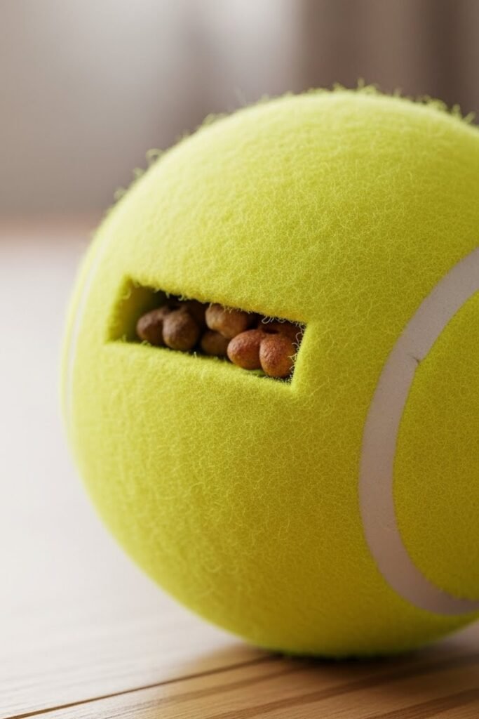 Make a simple puzzle toy using a tennis ball. Cut a small slit in the ball and hide treats inside. As your dog squeezes and rolls it, treats slowly fall out.