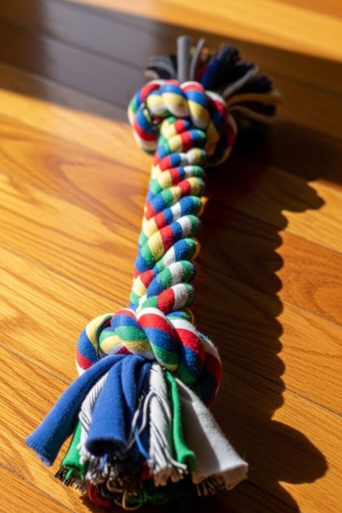 Roll an old towel lengthwise and tie knots along it. The thick fabric provides resistance for tug games and is gentle on teeth.