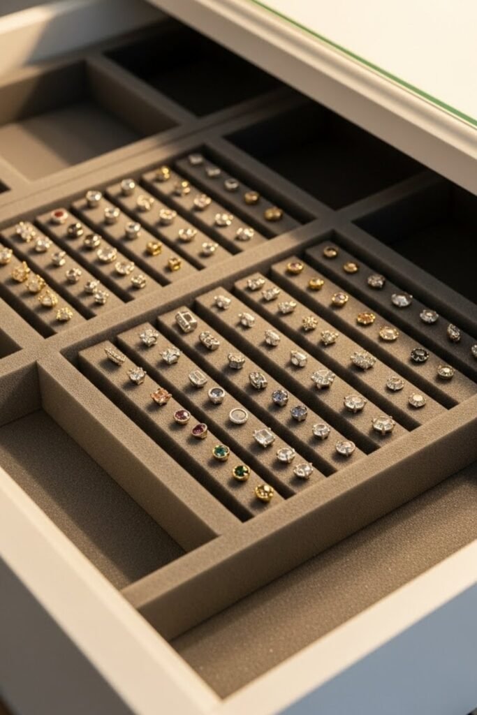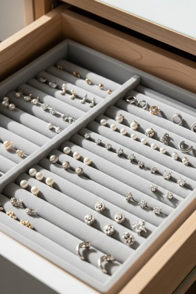 This option works best for large stud collections and protects earrings from dust. It’s ideal if you prefer hidden, organized storage instead of wall displays.