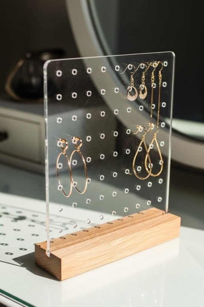 An acrylic earring holder gives a clean, modern look while keeping earrings visible. Drill evenly spaced holes into a clear acrylic sheet and attach it to a wooden or acrylic base.