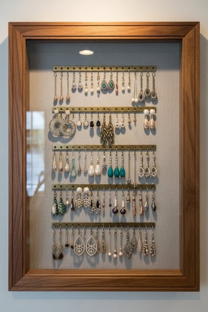 A shadow box earring holder offers deeper space for layered storage. Add rows of pins, hooks, or mesh inside the box to hold different earring styles.