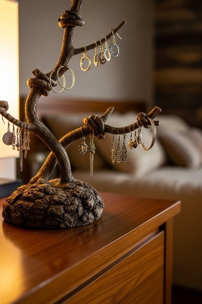 A branch stand earring holder uses a real or faux tree branch mounted on a base. The natural offshoots work as hooks for hanging earrings without extra hardware.