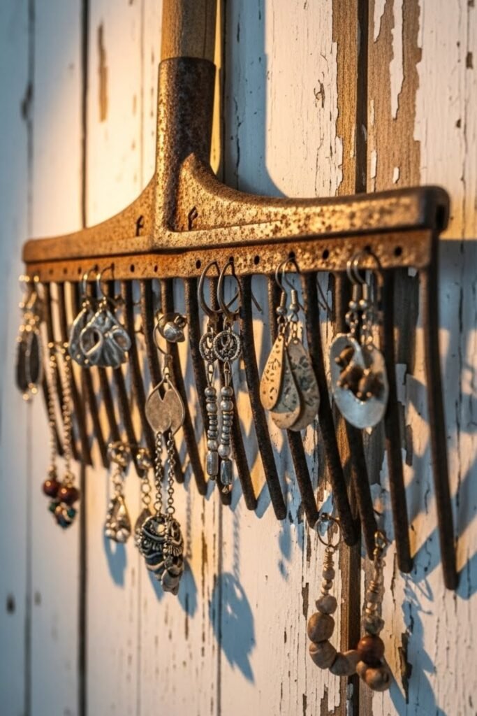 A vintage rake head earring holder is a creative way to reuse old tools. Mount the metal rake head horizontally on a wall and hang earrings from each tooth.
