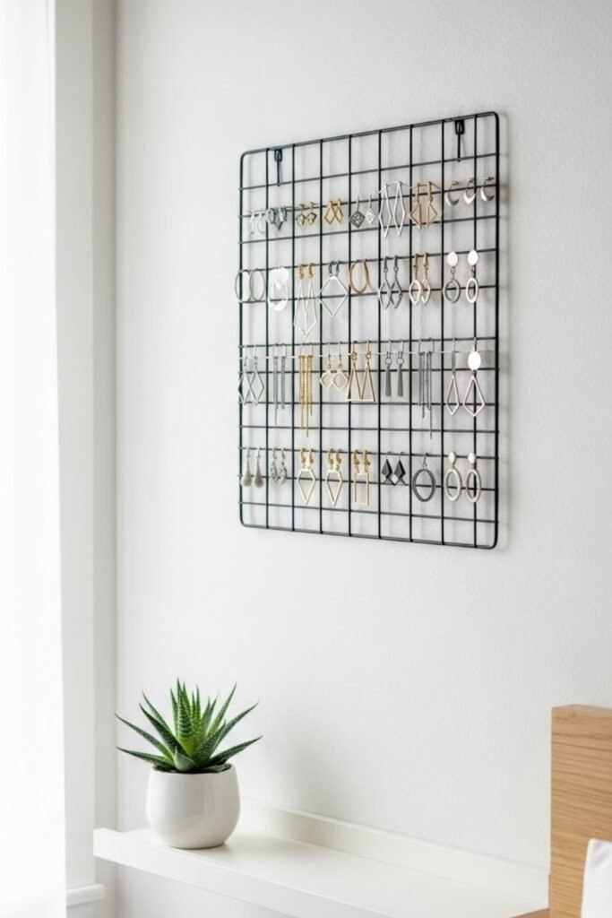 A wire grid earring holder offers a modern and structured way to organize earrings. Mount a small metal grid panel on the wall and hang earrings directly through the squares.
