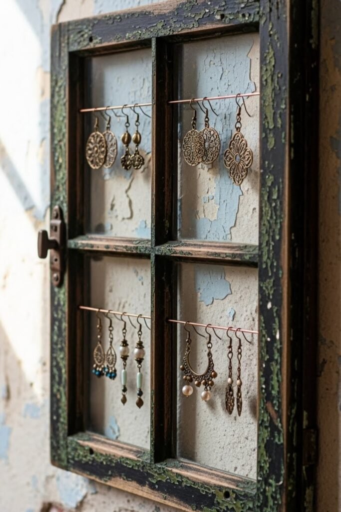 An old window frame earring holder uses multiple panes to create organized sections. Add wire or hooks inside each pane to hang earrings separately.