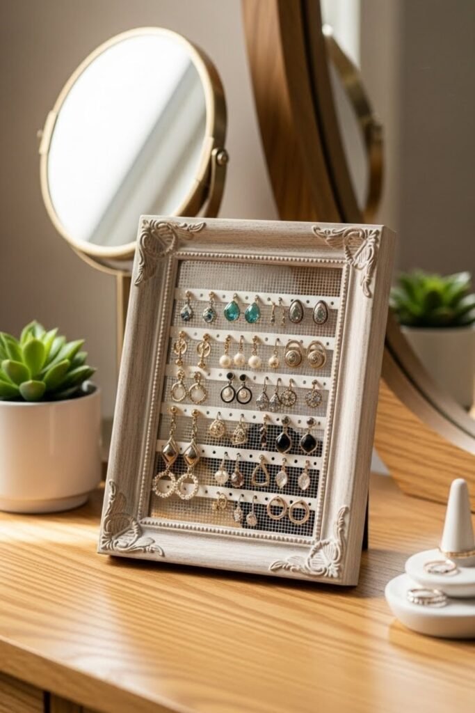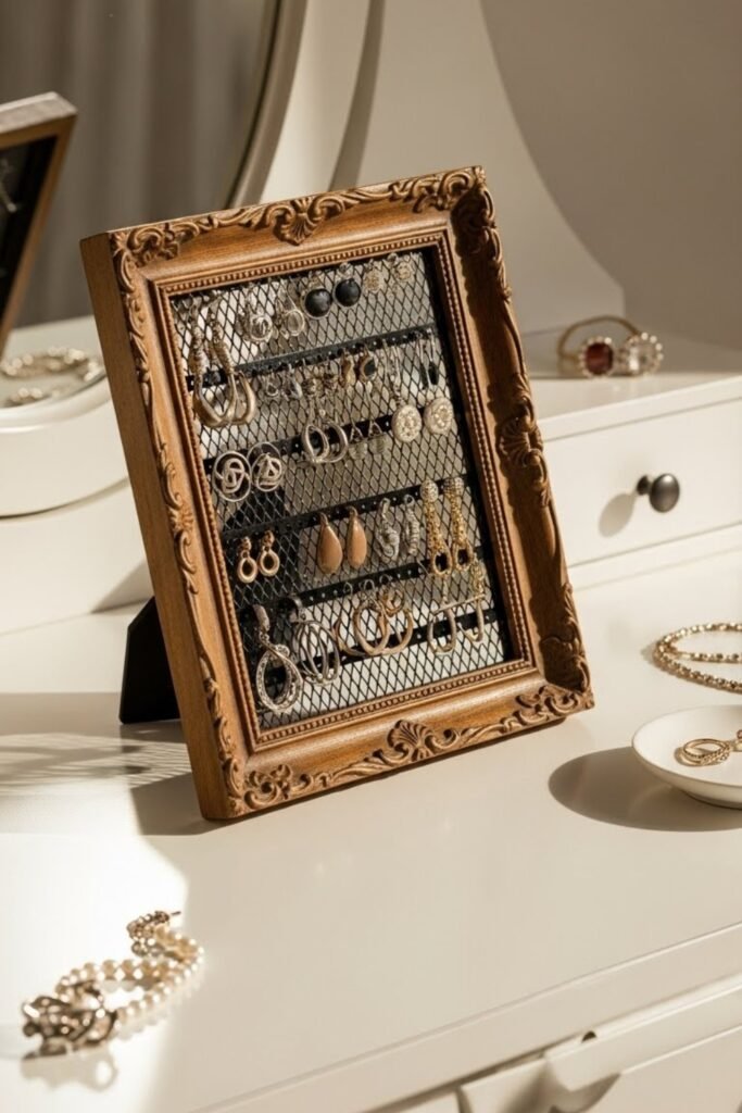 A frame easel earring holder uses a standing picture frame placed on a vanity or dresser. Replace the backing with mesh, lace, or wire to hang earrings securely.