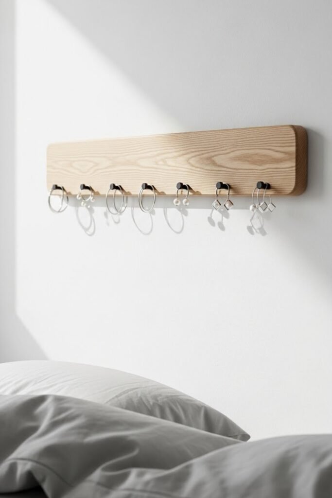 A wood strip earring holder is a simple, minimalist solution. Attach small hooks evenly along a thin wooden plank and mount it on the wall.