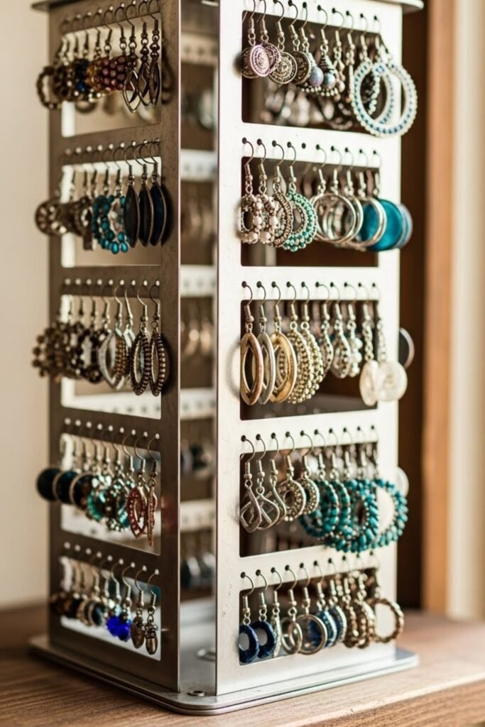 A rotating stand earring holder allows easy access to a large collection. Use a lazy-susan base with vertical rods or mesh panels to hang earrings on all sides.
