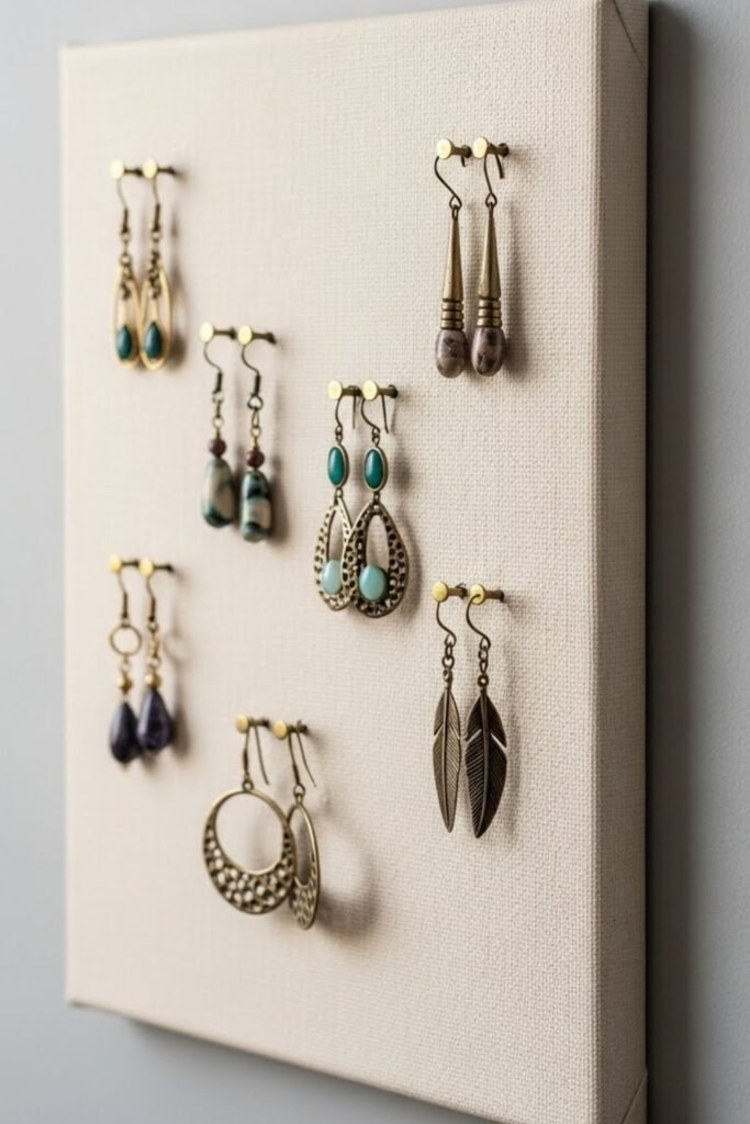 You can paint or decorate the canvas to match your room style. This idea works best for lightweight earrings and adds a creative, decorative element to bedroom or vanity walls.