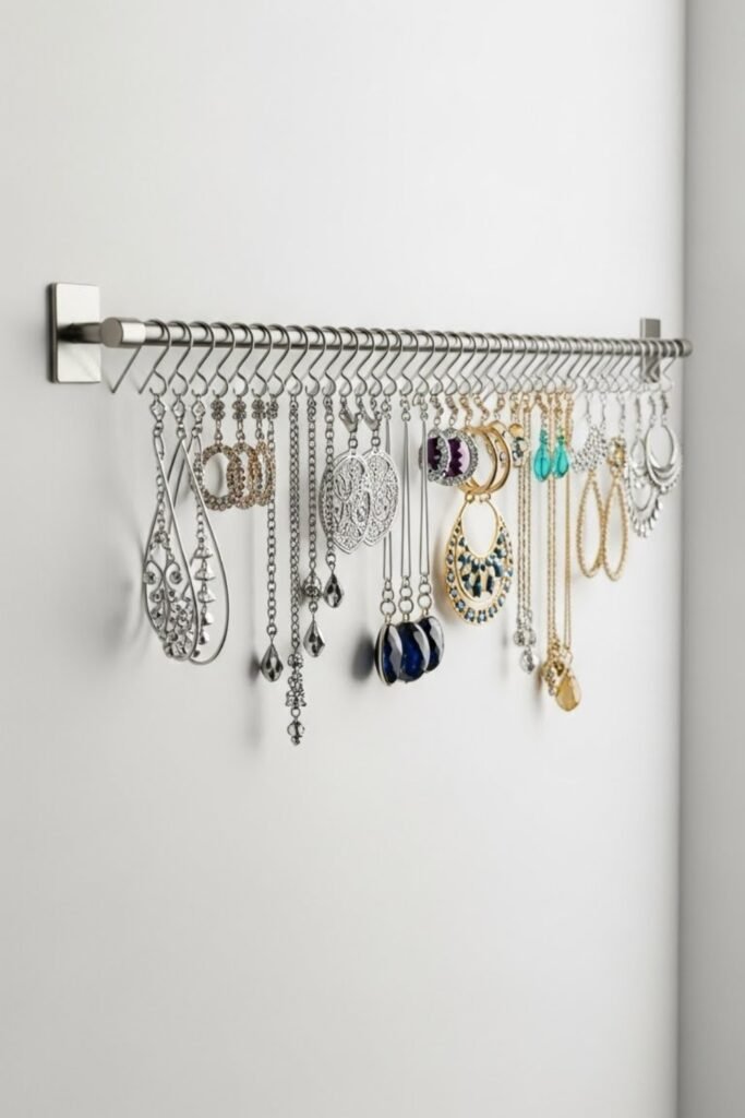 A hanging rod earring holder uses a slim rod mounted on the wall with S-hooks or small clips. Earrings hang evenly spaced, making pairs easy to spot.