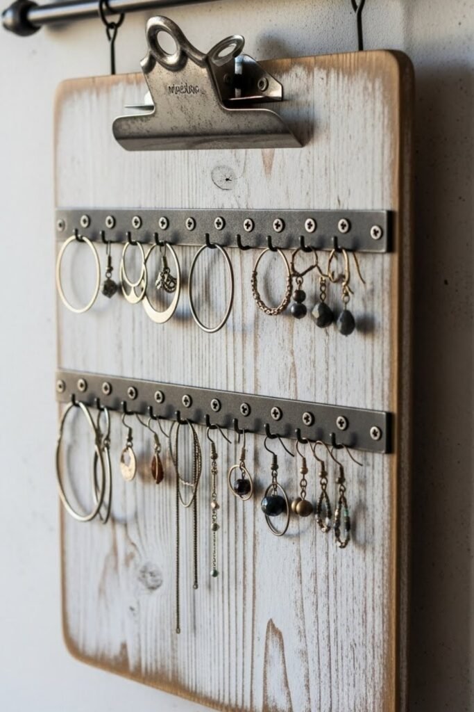 A clipboard board earring holder offers an industrial and flexible storage option. Remove the paper clip and attach hooks or mesh to the board surface.