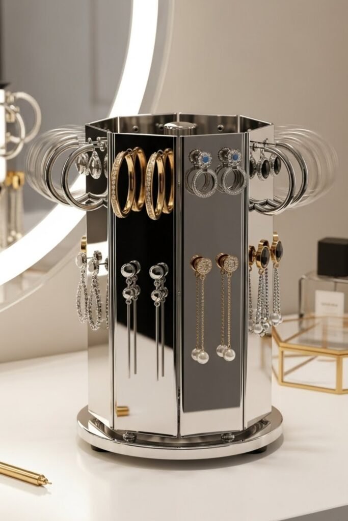 This design works best for hook earrings and saves space on vanities. It’s perfect if you want everything visible without spreading items across walls.