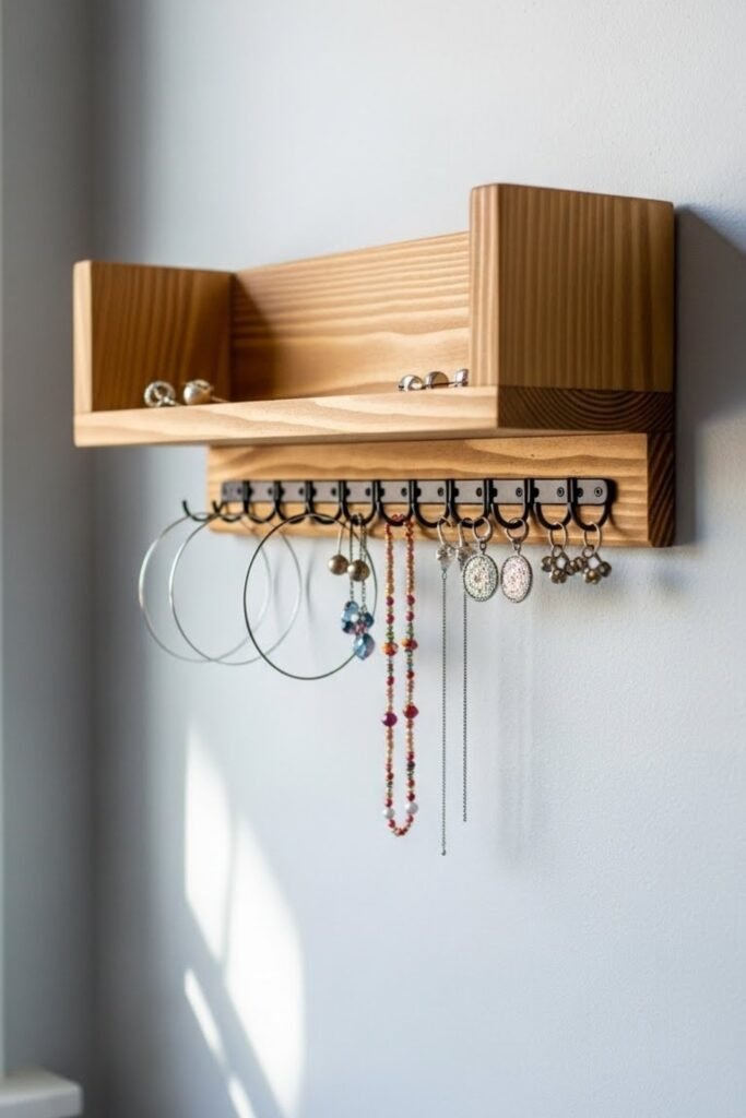 A small wooden shelf earring holder combines display and storage. Install tiny hooks or nails underneath the shelf to hang earrings while using the top for decor or jewelry boxes.