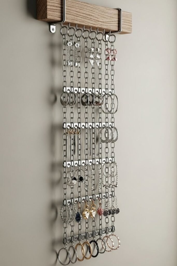 Chain strip earring holders use vertical metal chains attached to a wooden or metal bar. Earrings hook onto individual chain links, keeping pairs separated and visible.