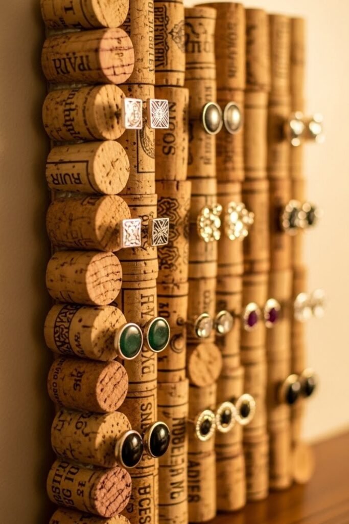 A wine cork earring holder is made by gluing corks together to form a compact board. Stud earrings push easily into the cork surface, while hooks can hang between gaps.