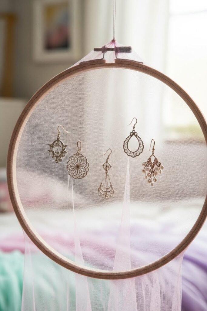A tulle hoop earring holder uses soft mesh stretched inside an embroidery hoop. The fine netting allows stud earrings to push through while hook earrings hang securely.