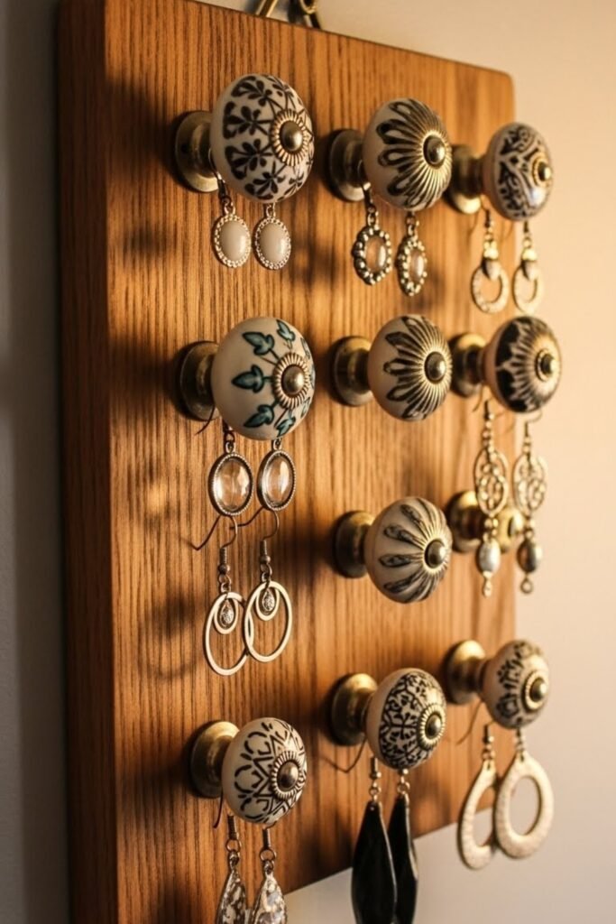 A knob board earring holder features decorative drawer knobs screwed into a wooden board. Earrings hang from each knob, making it easy to separate pairs.