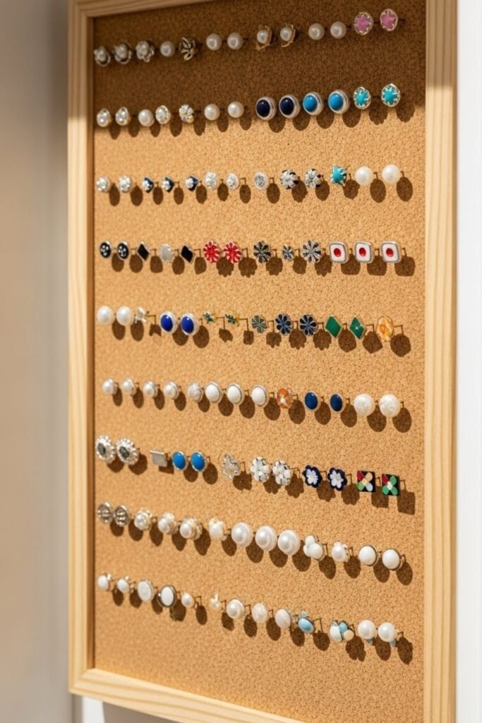 A cork board earring holder is perfect for stud earrings and small collections. Simply push studs directly into the cork surface and arrange them by color or style.