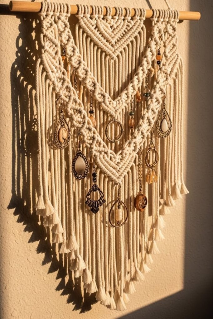 A macrame earring holder adds a soft, boho touch to bedroom or closet walls. Use cotton cord to create layered knots where hook earrings can hang naturally. Studs can be pinned through small woven gaps.