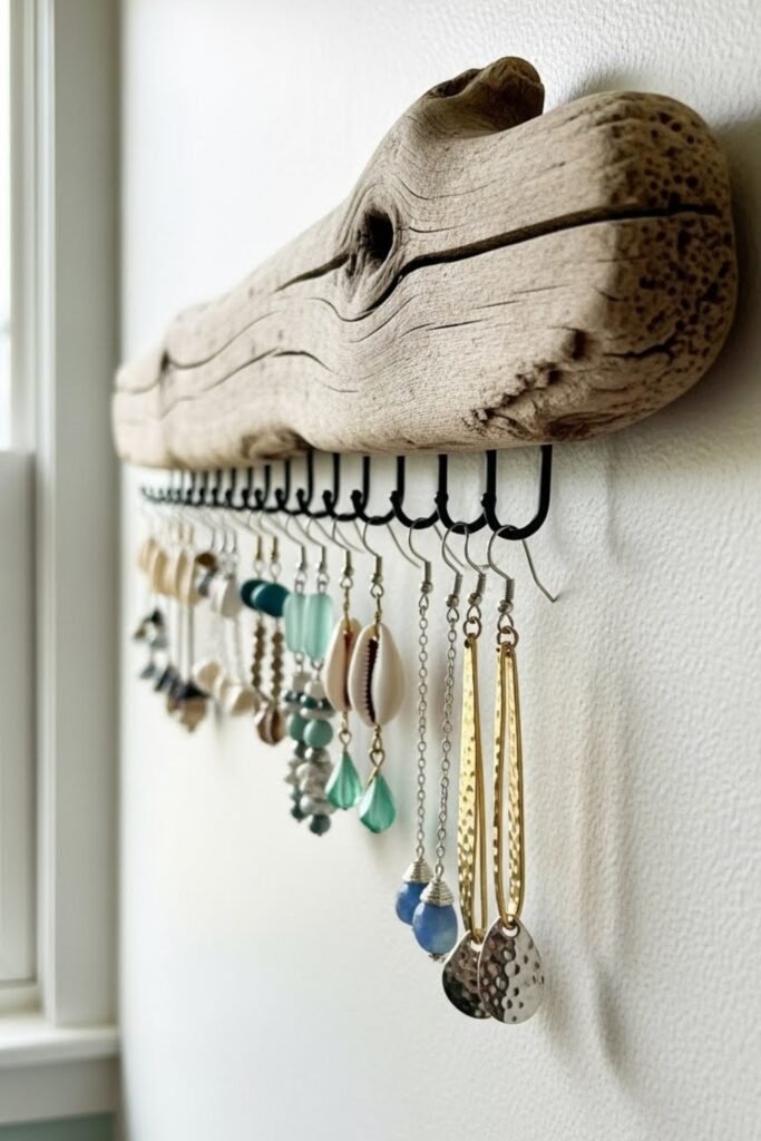 A driftwood earring holder uses a natural wood branch mounted horizontally on the wall. Add small screw hooks along the bottom to hang earrings neatly.