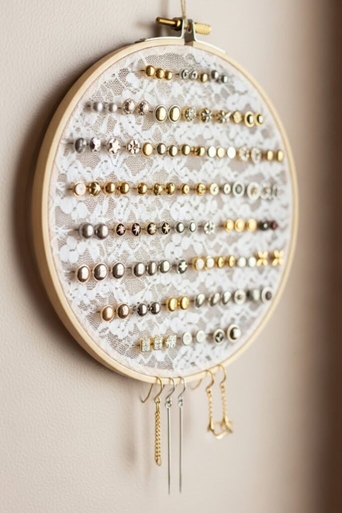 Hook earrings hang through the lace openings, while studs push through easily. This idea works best for lightweight earrings and adds charm to vanities, dressers, or bedroom walls.