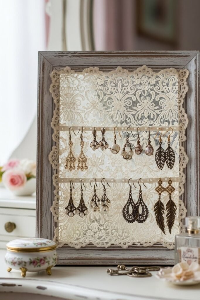 A lace frame earring holder gives a vintage, delicate look while staying functional. Stretch lace fabric tightly inside a picture frame and secure it at the back.